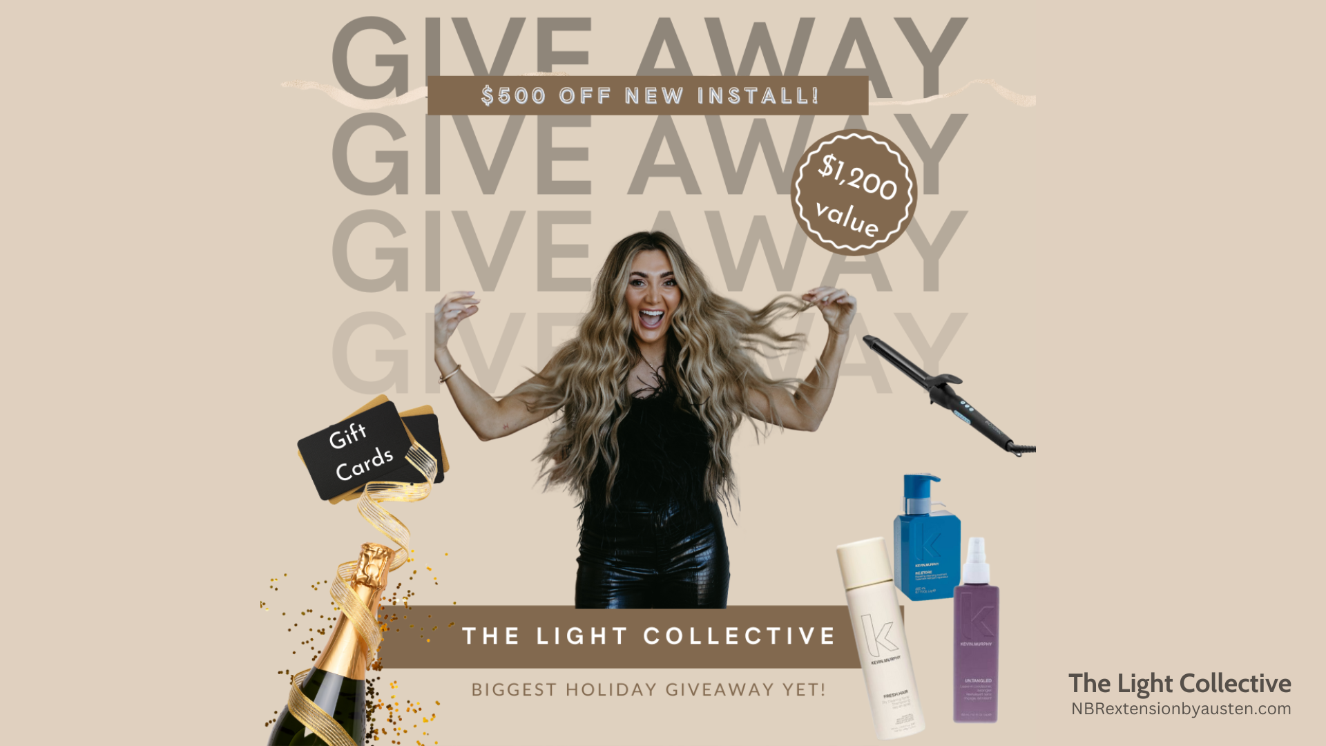 This Christmas, we are expressing our gratitude to our incredible guests at The Light Collective by hosting a giveaway that's nothing short of extraordinary. Picture this – a $500 off coupon for a New Install, a sleek Bio Ionic Curling Iron to style your new locks, a $100 gift card for a Pinky Promise Russian Manicure, $100 off on Permanent jewelry from B.linked, a $50 gift card for Confidence by Mariah (offering teeth whitening, spray tan, facial), a bundle of top-notch haircare products, and even a bottle of Veuve to celebrate your stunning new look. This is not just a giveaway; it's a lavish package of self-indulgence, curated for those who have been dreaming but haven't taken the plunge.